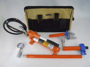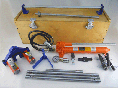 Kit contains twin 10 ton ram jacks, 10 ton hand pump w/ 6' hose, guage, and tool box included for all above. Click here to view available wedges and pulling heads |