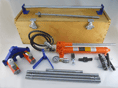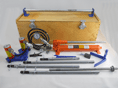 Kit contains twin 10 ton ram jacks, 10 ton hand pump w/ 6' hose, guage, wedge holding tool, and tool box included for all above.